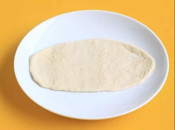 取一个面团,按扁,擀成椭圆形。