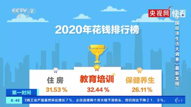 央视财经频道《中国经济生活大调查》栏目发布「2022年花钱排行榜」,位居前三的分别是教育培训(32.44%)、住房(31.53%)和保健养生(26.11%)。